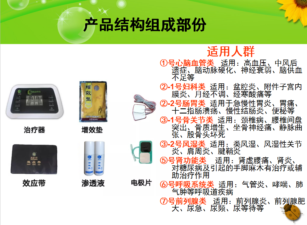 多功能治療儀由治療器、效應(yīng)帶、電極片、按摩帶、增效中藥包、速滲液六部份組成。