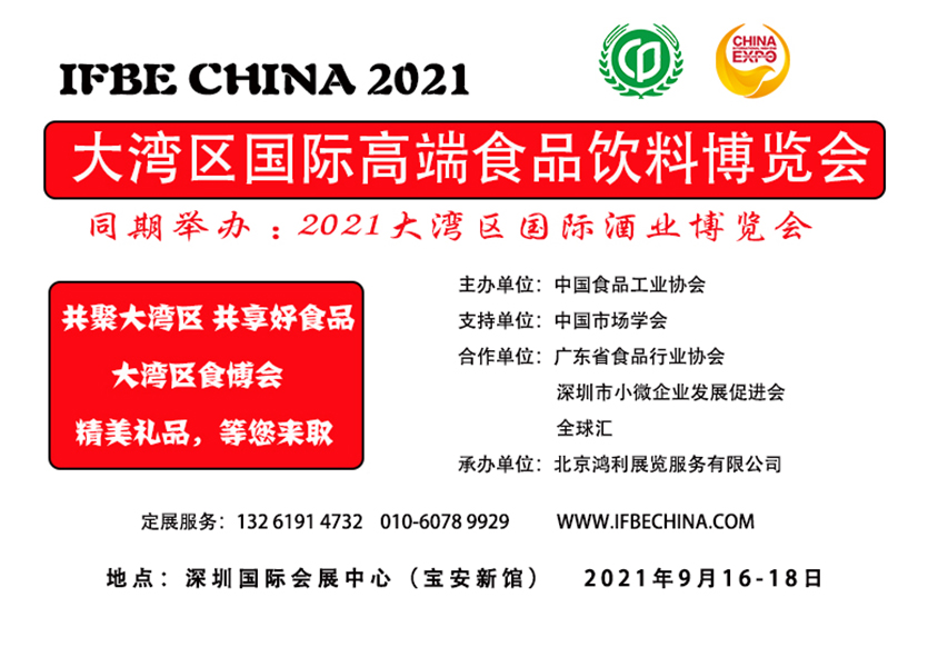 2021年9月16-18日,由中國(guó)食品工業(yè)協(xié)會(huì)主辦,北京鴻利展覽服務(wù)有限公司承辦的2021大灣區(qū)國(guó)際高端食品飲料博覽會(huì)(以下簡(jiǎn)稱“2021 IFBE China大灣區(qū)食博會(huì)”)將在深圳國(guó)際會(huì)展中心(寶安新館)舉辦。本屆大灣區(qū)食博會(huì)以“共聚大灣區(qū)、共享好食品”為主題,以全球化視野來(lái)詮釋未來(lái)食品酒水飲料行業(yè)發(fā)展的趨勢(shì),全力打造食品酒水飲料行業(yè)的國(guó)際化貿(mào)易平臺(tái)。